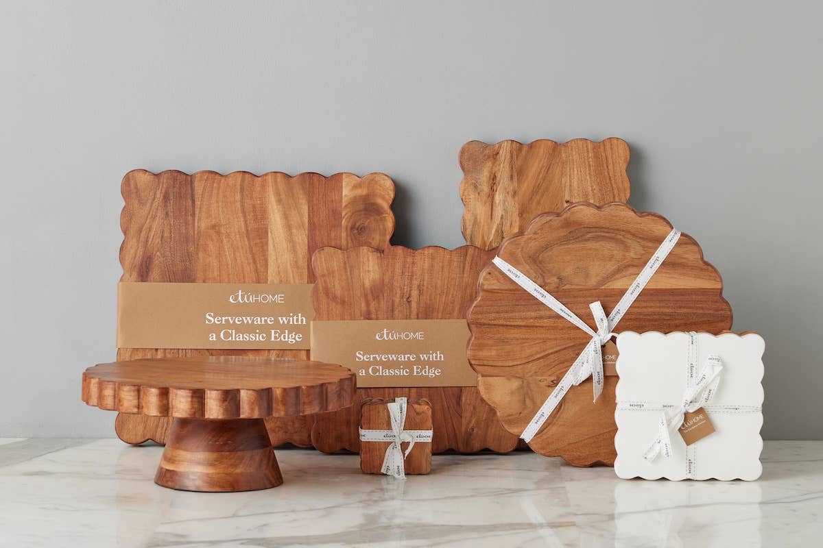 Discover the perfect blend of modern style and whimsical charm with our Square Scalloped Cutting Board. The unique scalloped edges add movement and subtle femininity while the natural wood grain adds texture to your countertop. With its trendy design, this functional piece of art will become a staple in any kitchen. Inspired by the classic architecture of 18th Century Europe, the Scalloped Collection captures this old-world charm while blending seamlessly into contemporary aesthetics.