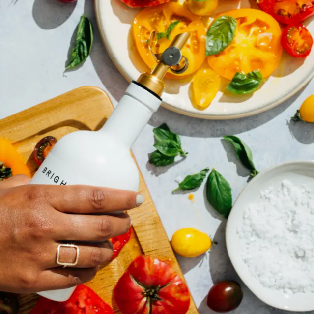 Fits in - and looks beautiful with - all full size Brightland olive oil bottles. (Please Note: The Spout does not fit our 100mL mini bottles or our vinegars)